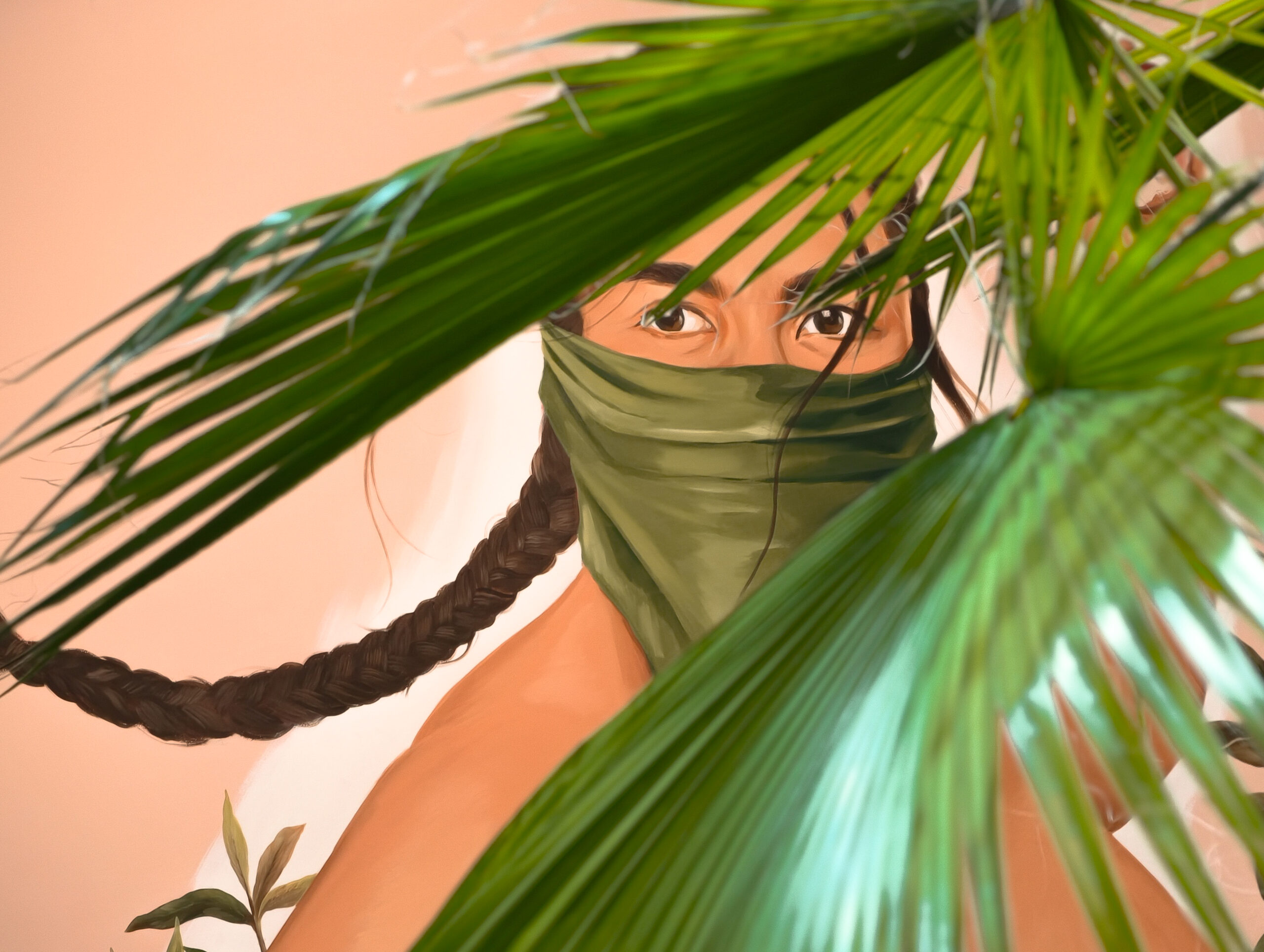 In Priscilas Werken sind die handelnden Akteure Frauen in einer dynamischen Situation. Als besonderes Stilelement verwendet sie meist ein grünes Tuch, das die Akteurinnen sich mal um den Arm wickeln oder auch als Identitätschutz vor dem Gesicht tragen wie hier.